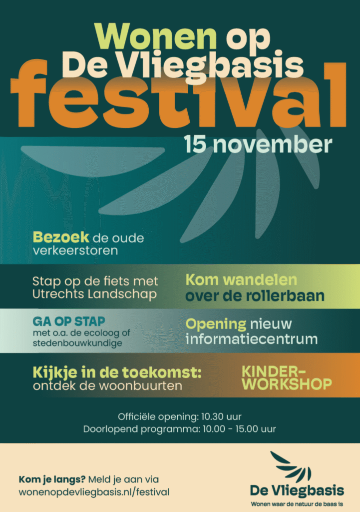 Ontdek wonen waar de natuur de baas is. Op zaterdag 15 november openen we de deuren van De Vliegbasis en wordt het nieuwe informatiecentrum officieel geopend! Van 10:00 – 15:00 uur ben je van harte welkom bij de oude verkeerstoren om De Vliegbasis te verkennen. Het hele projectteam is aanwezig om je alles te vertellen over de plannen, de nieuwe woonbuurten en de bijzondere natuur en historie in het gebied.