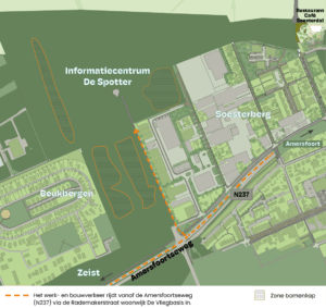 Tijdens de werkzaamheden worden de werkterreinen afgezet. Het werk- en bouwverkeer rijdt vanaf de Amersfoortseweg (N237) via de noordelijke Rademakerstraat (richting informatiecentrum De Spotter) de wijk in en uit.